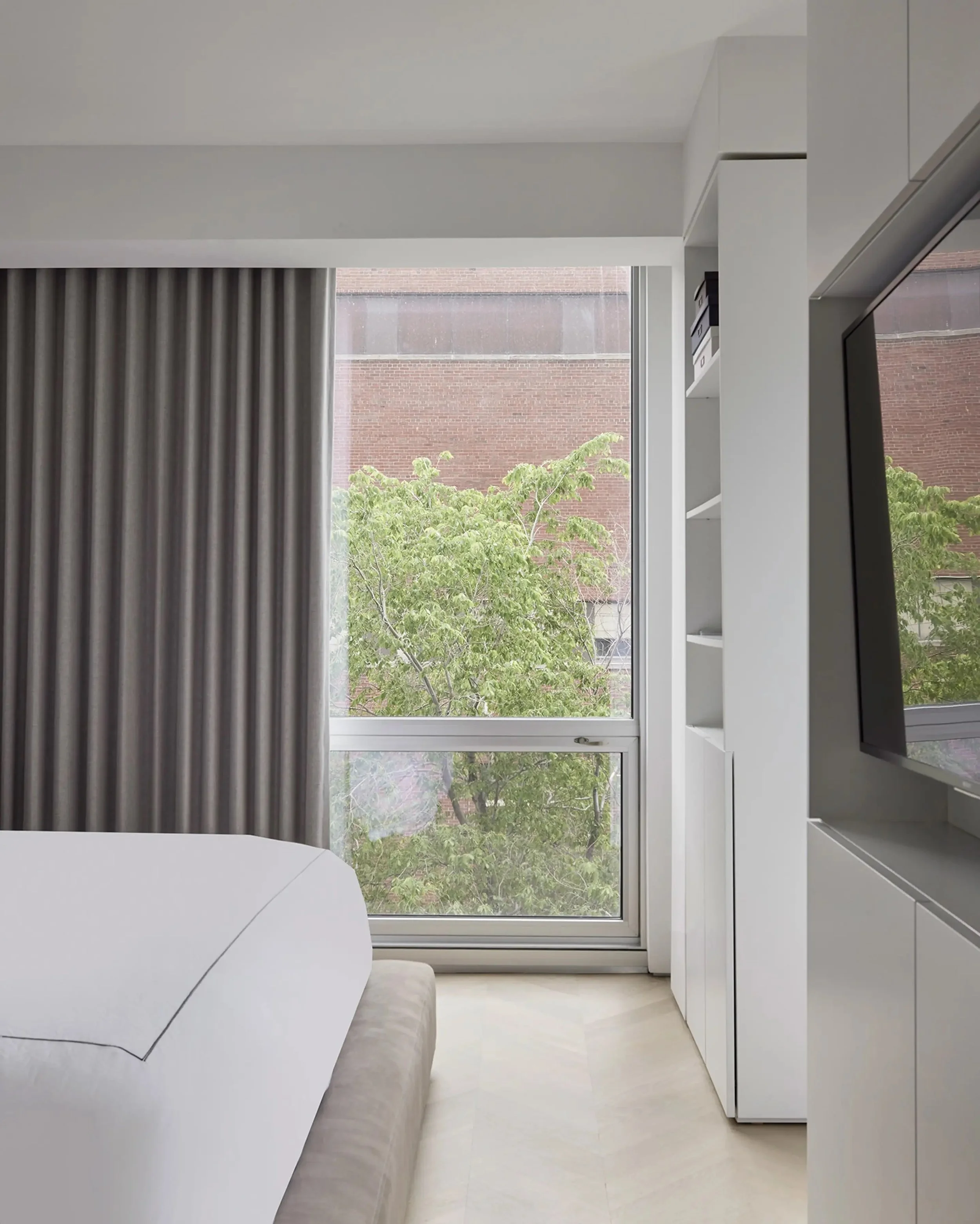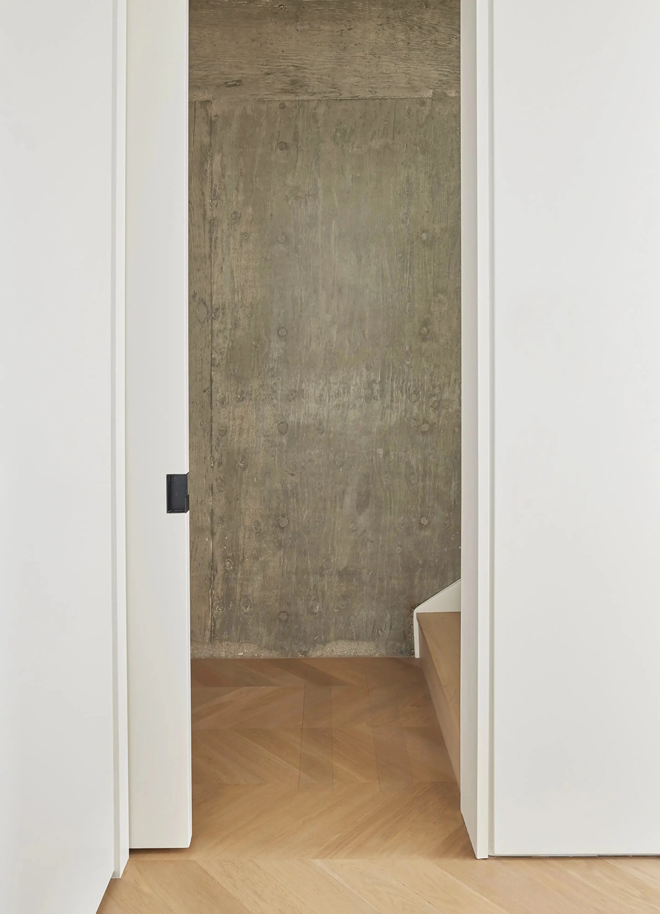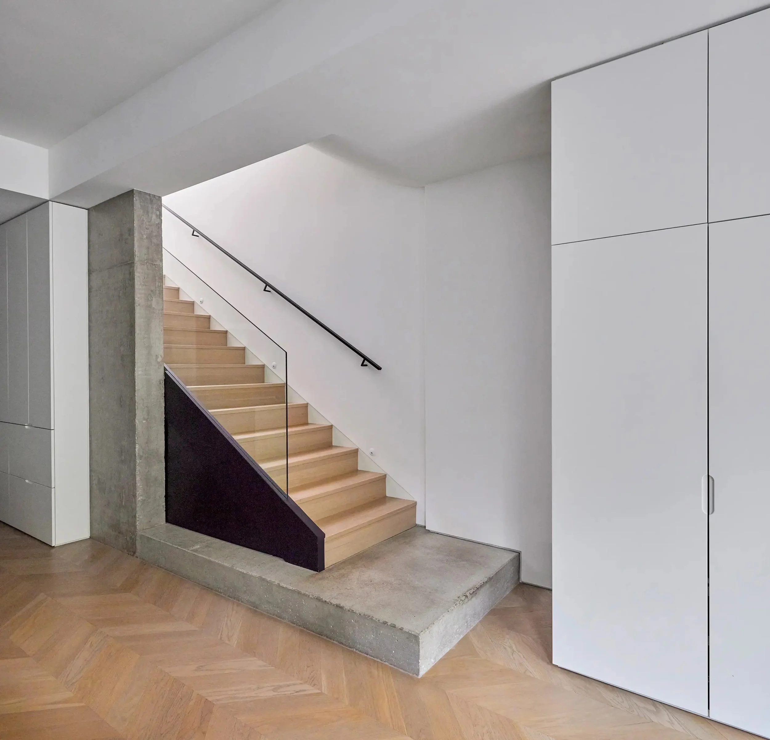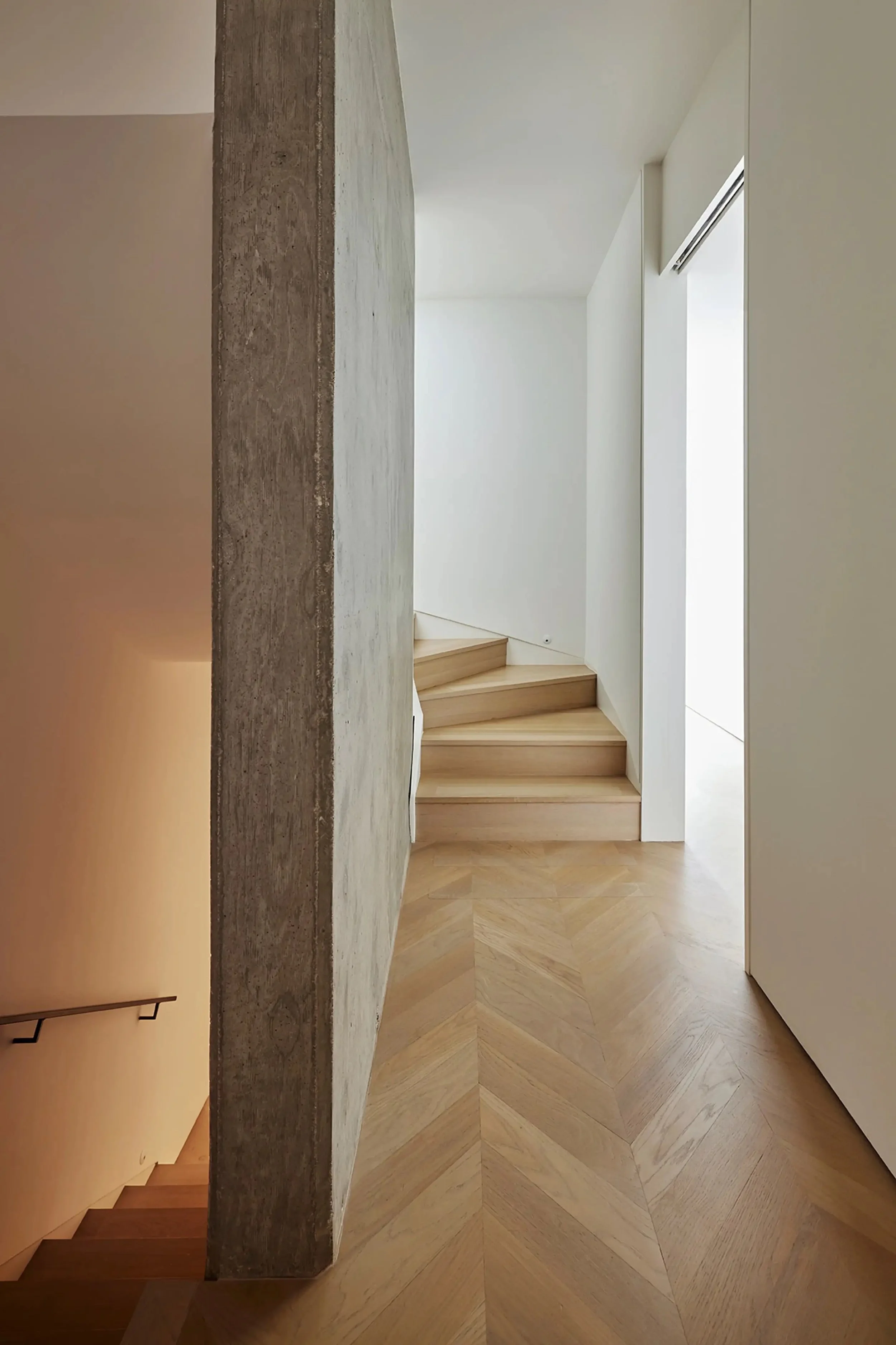 The integration of custom millwork into the existing framework of the townhouse allows for selective texture and materiality to be celebrated against a crisp and bright backdrop. The re-configured stair wraps around an exposed concrete shear wall that links the spaces to each other while adding texture to the project. White oak chevron flooring and exposed concrete structural walls introduce both warmth and raw character into the project's 4 floors with museum-like detailing. The residence’s bathrooms include minimalist plumbing fixtures, curbless showers, and custom vanities. Each fixture and finish was chosen to elevate the experiences of everyday. The most mundane daily tasks are infused with thoughtfulness and intrigue, enhancing the life our clients choose to live.