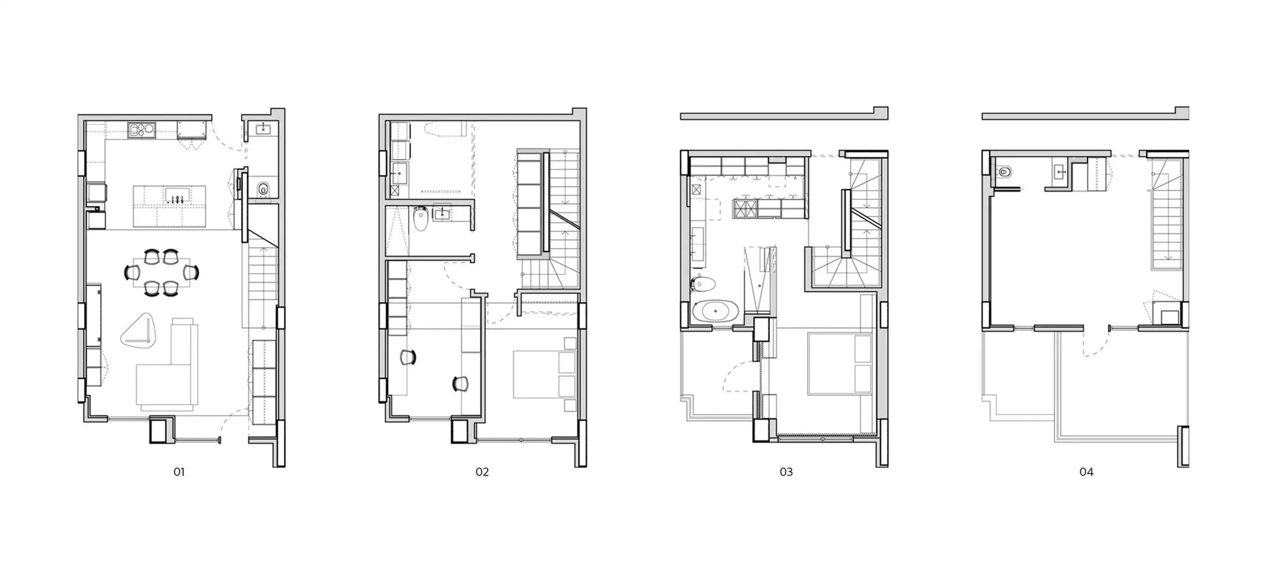 We sculpted the interior to provide an intuitive layout without any wall protrusions or awkward soffits. The first floor kitchen and living space use millwork and furniture to define programmatic functions while still allowing both to flow into each other. The design efficiently choreographs the existing conditions back to the essentials, stripping away all of the awkward and careless finishes.